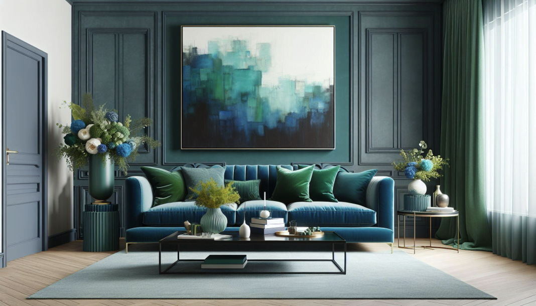 Utiliser les mêmes tons dans différentes pièces de la maison peut renforcer cette harmonie. Par exemple, des coussins verts sur un canapé bleu rappellent subtilement d’autres éléments de votre décoration. De même, un tableau aux nuances de bleu et de vert peut lier l’ensemble de la pièce à votre style décoratif.